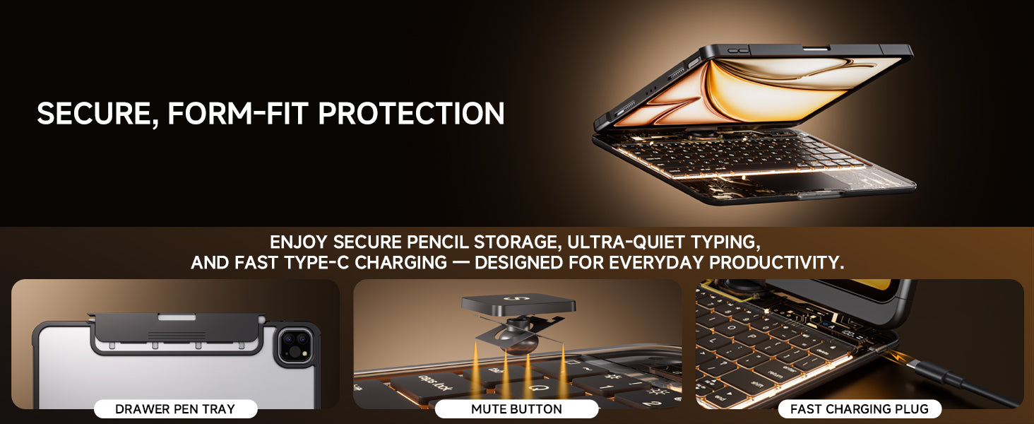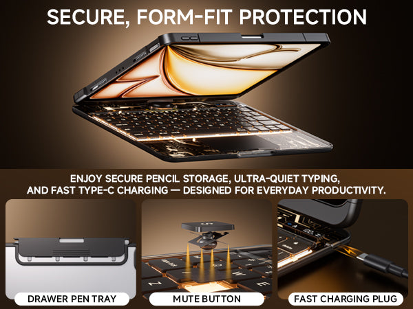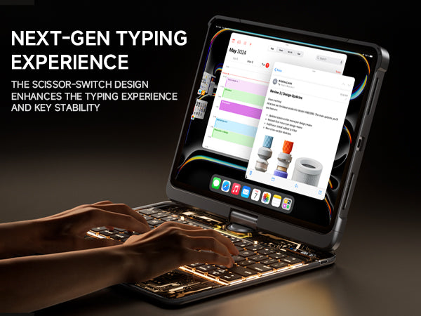 • 【Flexible Pencil Slot + Silent Typing】: The flexible pen holder supports magnetic attachment, while the quiet scissor-switch keys provide a silent and responsive typing experience.